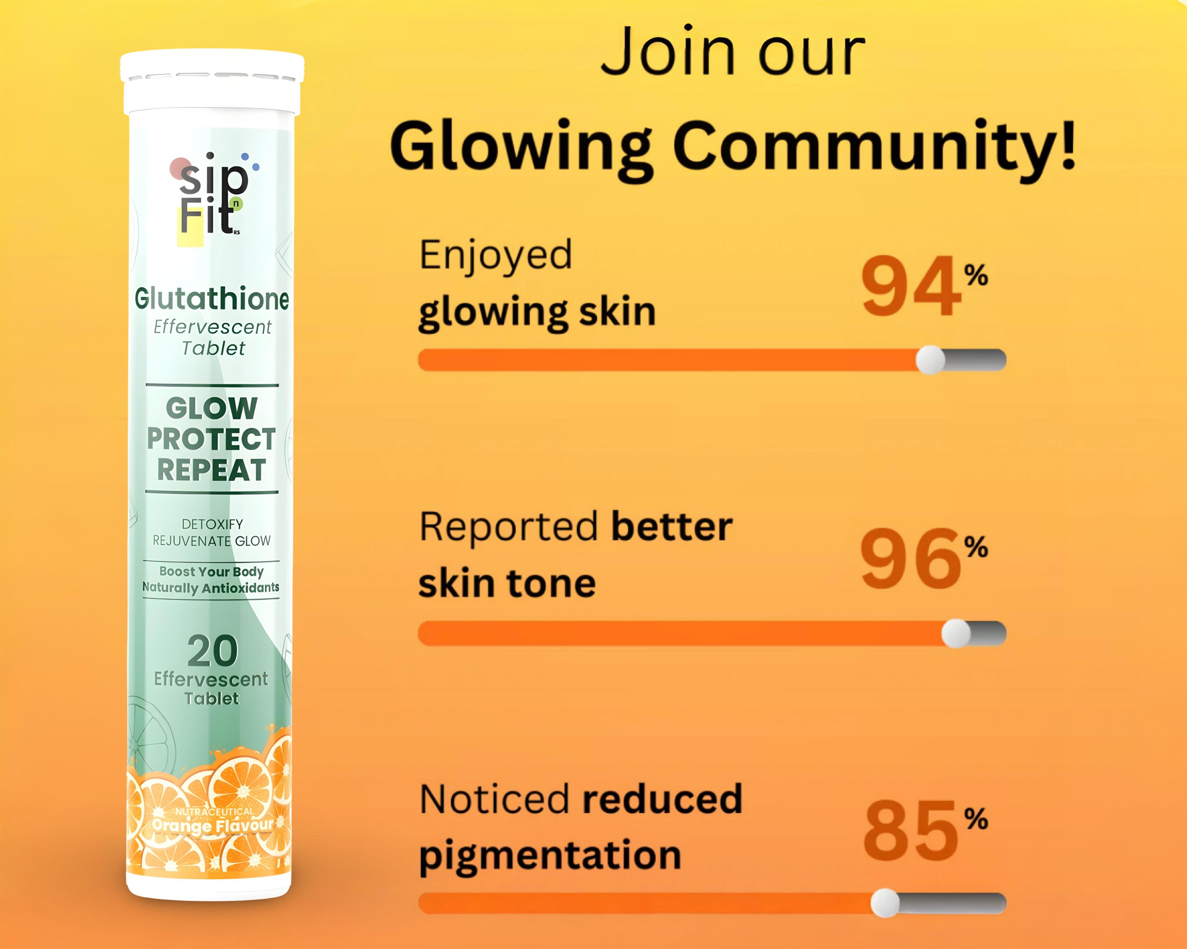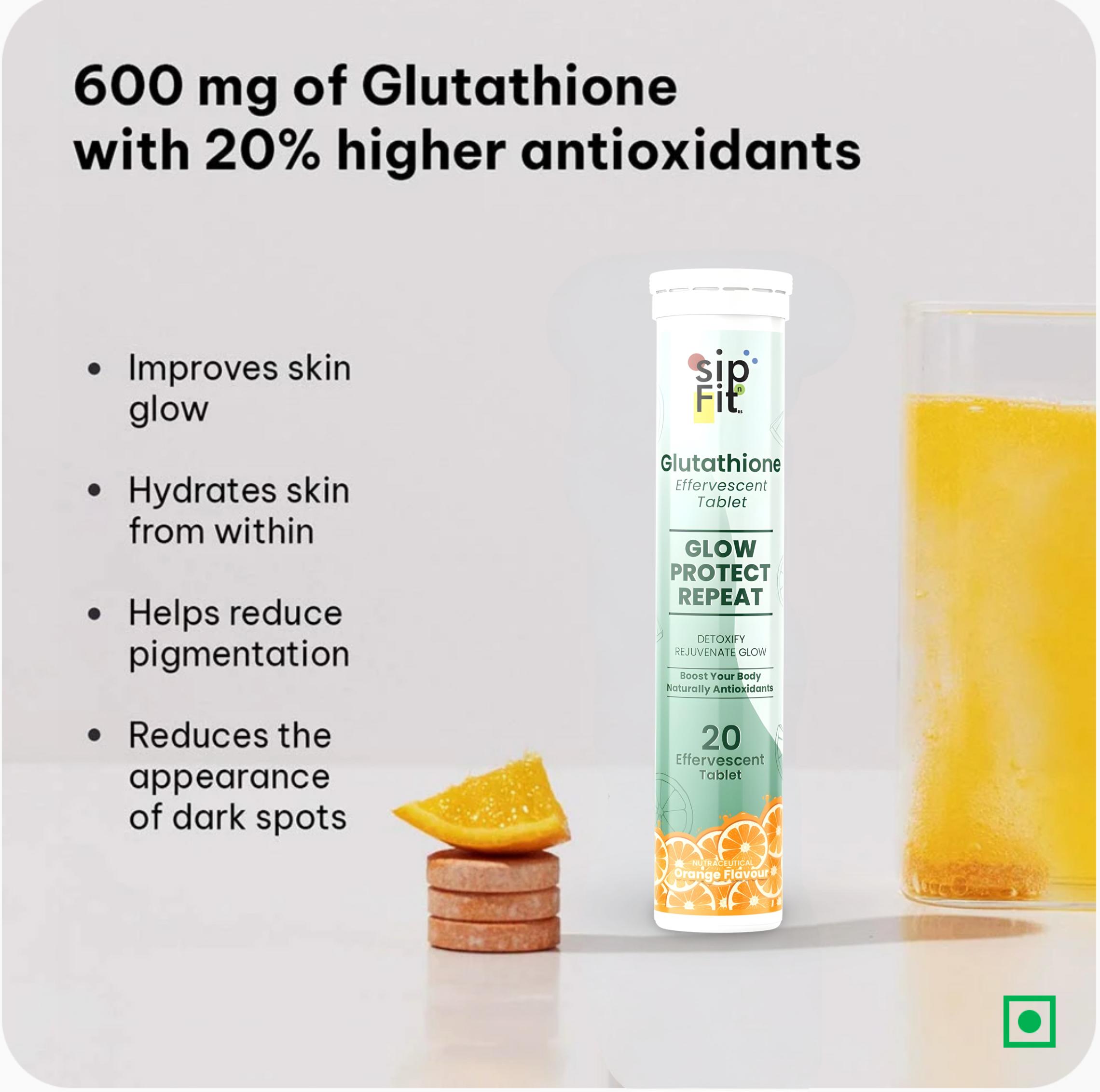 SipFit Glutathione Effervescent Tablets (Orange Flavor) are a powerful antioxidant supplement designed to detoxify the body, promote skin radiance, and enhance overall well-being. Glutathione is known for its skin-brightening properties, ability to fight free radicals, and immune-boosting effects. These effervescent tablets dissolve easily in water, offering a refreshing orange flavor while ensuring maximum absorption.